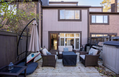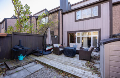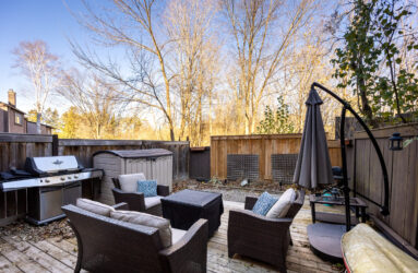 The backyard is a true sanctuary, backing onto a serene wooded area with mature trees that provide